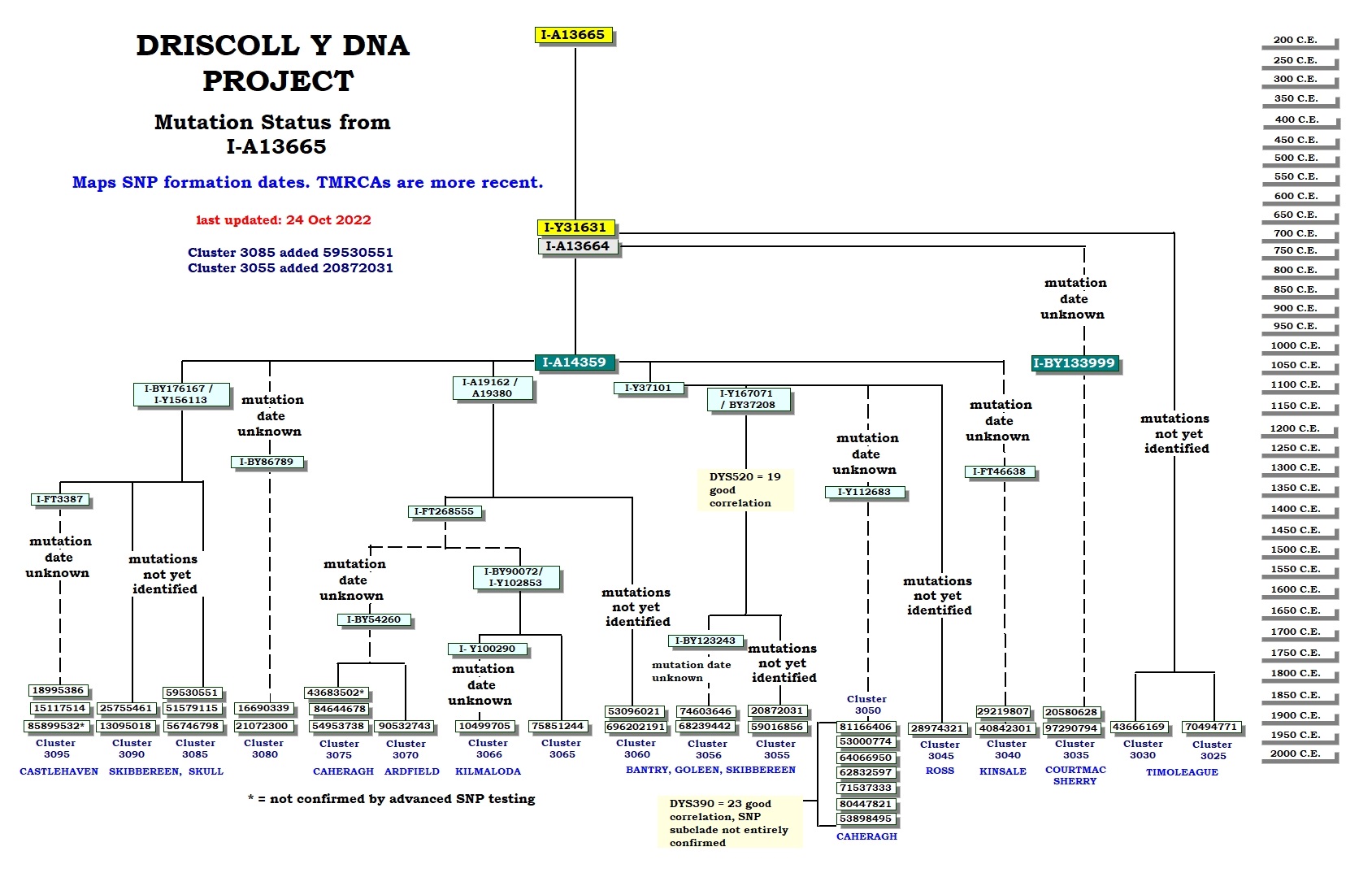 The parent SNP of all Driscolls on this page is I-PF4135. The closest defining parent SNP of most project Driscolls falling into this haplogroup is I-A14359.